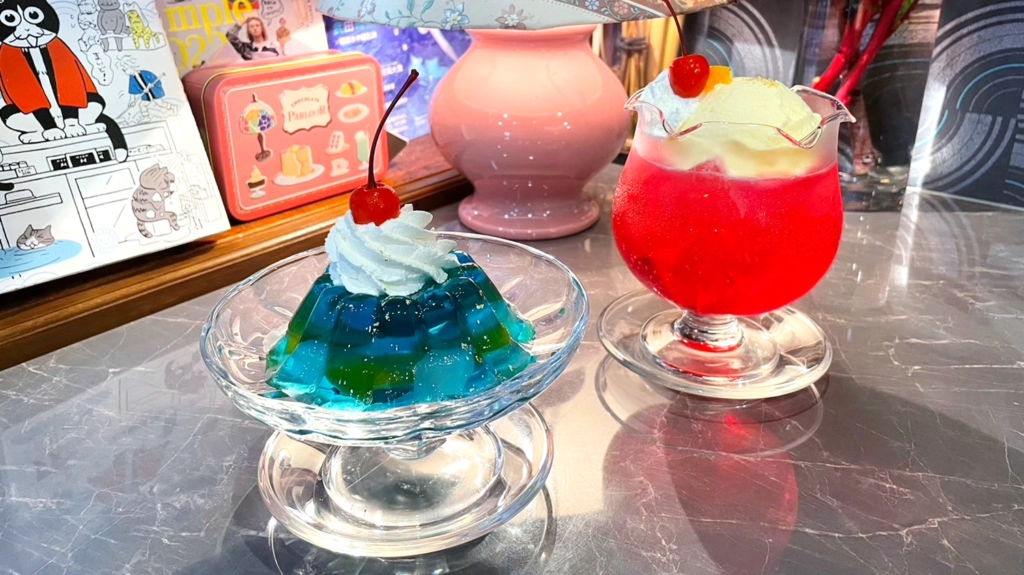 深海果凍(深海ゼリー)同樣是發想自店名的創意甜點,以藍色夏威夷糖漿(ブルーハワイシロップ)調製成海水色的布丁中,藏著蜜桃、椰果、蜜柑等果塊,看起來就像是海裡的珊瑚、熱帶魚等小生物們,令人眼睛一亮。