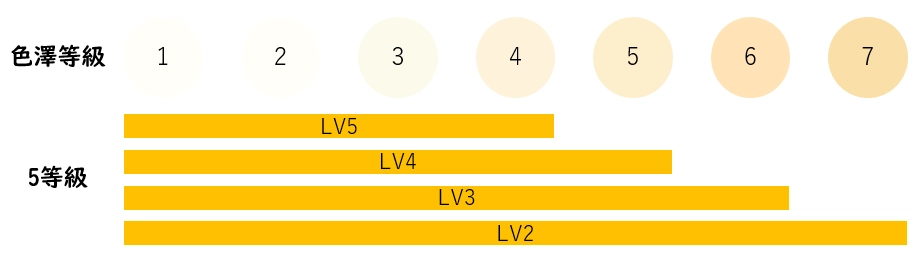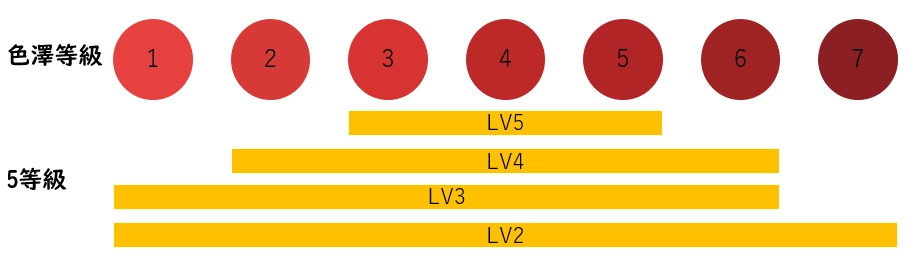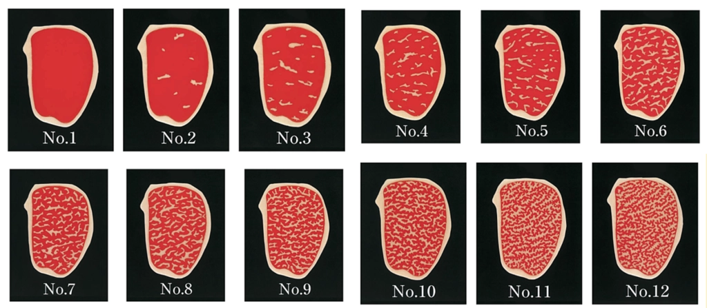 肉質等級評價的項目包括肉的顏色和光澤,脂肪的含量與品質,並賦予1到5分的分數,分數愈高也表示肉質等級愈優。