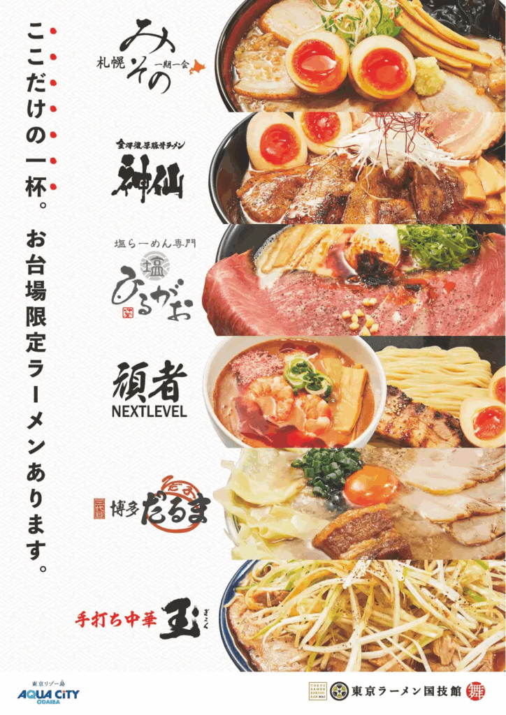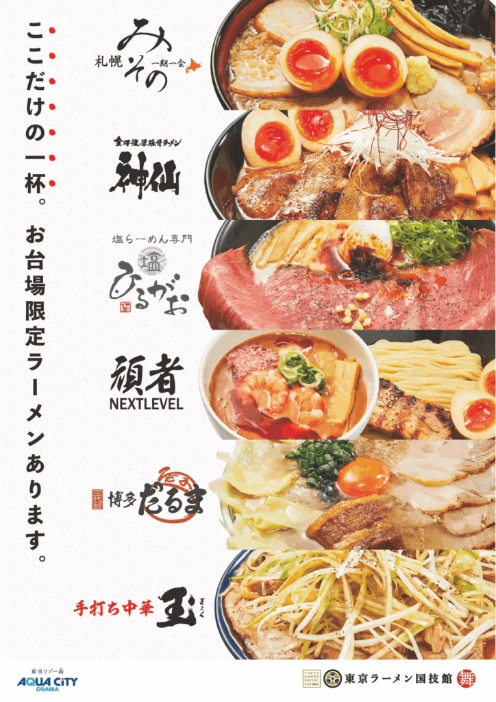 位於台場Aqua City5樓的東京拉麵國技館 舞,集結全日本6間人氣拉麵店於一處,是來訪台場時絕不能錯過的拉麵殿堂。每家店皆推出僅限此處的限定拉麵,詳列如下。