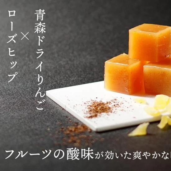 這可愛小巧的橘色凍方塊,就是用了蘋果基底下去製作的羊羹,另外搭配了擁有豐富維他命C成分的薔薇果,整體吃起來是清爽的風味!「津輕」是位於青森北端擁有豐富自然資源的平野,也是青森蘋果的產地,這款蘋果羊羹完全將豐富的蘋果香鎖在一顆顆的小方塊裡頭,是蘋果控絕對不能錯過的甜點啊!