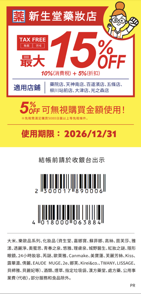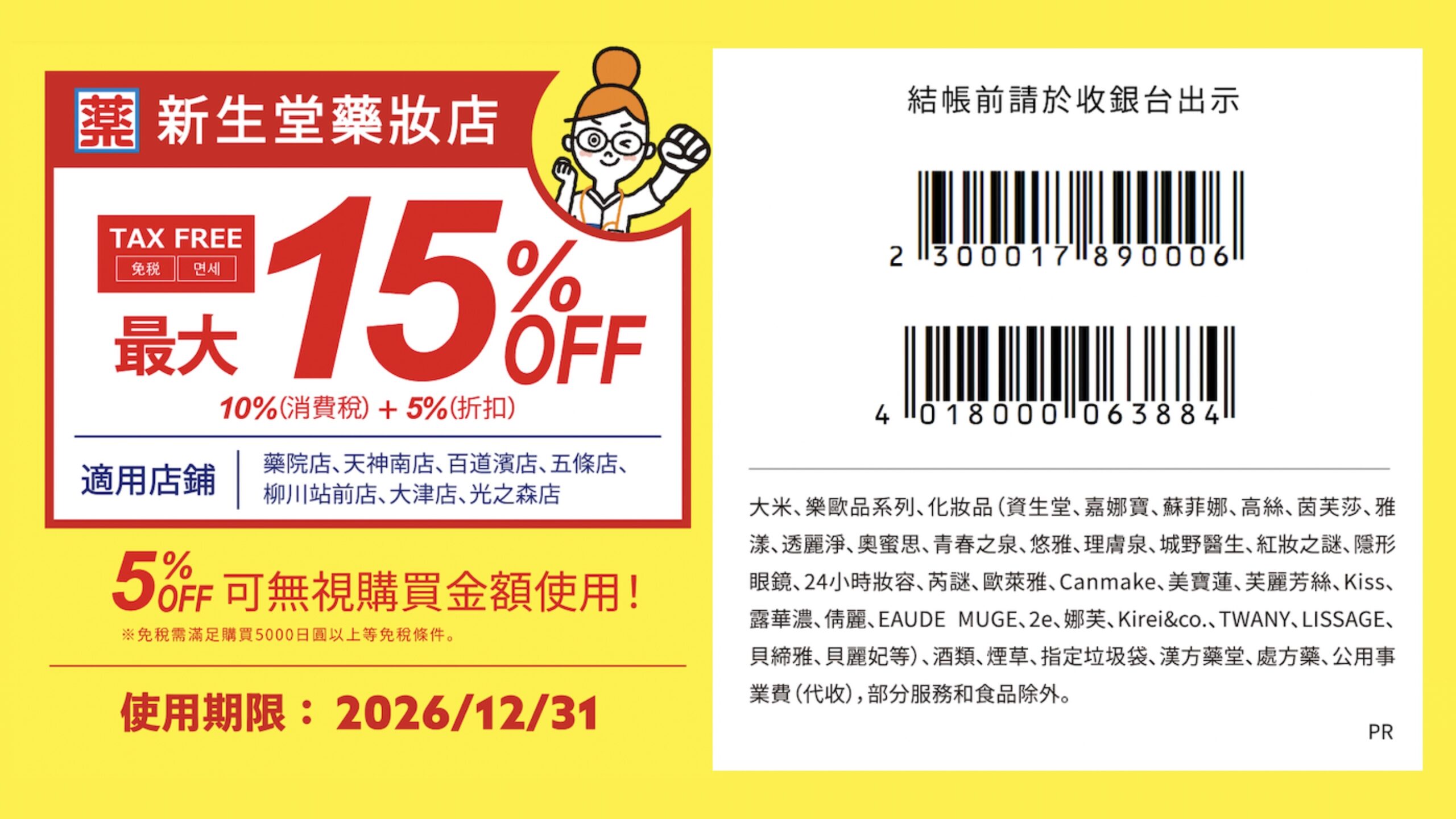 在日本九州地區旅行,逛膩一般藥妝店了嗎?今天要介紹深受當地社區喜愛的藥妝店:新生堂藥局,並分享「食探日本讀者專屬優惠券」,消費達5,000日圓,結帳時出示即可享受15%OFF折扣優惠,超低門檻讓遊客不用辛苦湊錢。無論是想購買小額日常用品、保養品或伴手禮,都可以用85折的優惠價格輕鬆入手!